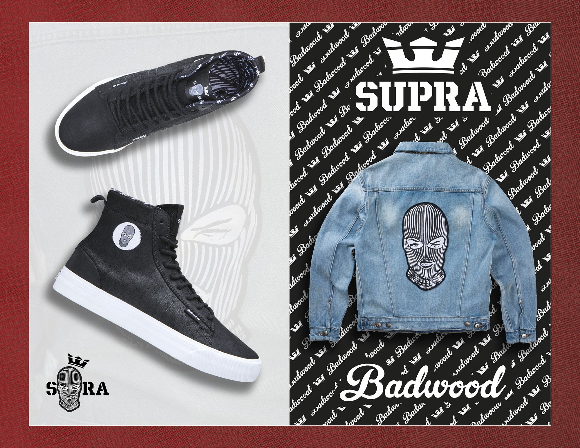 In celebration of our partnership and success, Badwood x Supra team up again for a limited-edition capsule, highlighting iconic style and art in a 2-piece collection designed for unisex appeal. The footwear is complemented with a wardrobe staple, vintage inspired denim jacket, complete with embroidery patches and an enamel pin collection of icon Badwood art.